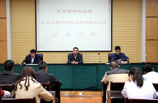 2015年10月9日,市中心血站召开了效能风暴民主评议行风政风工作动员大会,全体干部职工参加了动员会。这次动员大会是对民主评议政风行风工作的再动员、再安排、再部署,必将有力地推进我站民主评议政风行风工作。 动员大会上,安有水副站长宣读了《天水市中心血站2015年效能风暴行动民主评议政风行风实施方案》,对民主评议工作从目标任务、评议内容、方法步骤、工作要求等四个方面进行了全面安排。苏建伟副站长做了动员讲话:开展效能风暴民主评议政风行风工作是行业作风建设与采供血业务发展深度融合的需要,全体职工一定要提高认识、统一思想,积极投身民主评议政风行风工作;要突出重点,认真贯彻和纠正行业作风方面存在的诸如不履行服务承诺、降低服务标准、工作效率不高等问题;将经常教育与日常监督相结合,对出现的苗头问题早发现、早提醒、早纠正,实现监督关口的前移,确保民主评议政风行风工作取得实效;全站职工一定要按照站上的统一安排把这项工作组织好、落实好,以确保采供血各项工作持续、健康、快速发展。