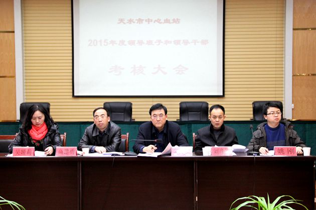 1月7日下午,市委第六考核组在考核组副组长、市委统战部常务副部长刘峰的带领下,对市中心血站2015年度领导班子和领导干部工作业绩、党风廉政建设责任制、工作落实年等工作落实情况进行考核。部分医院输血科负责人及血站全体干部职工参加了考核汇报会。 汇报会上,刘峰代表市委第六考核组做了讲话,对本次血站领导班子、班子成员述职述廉工作提出了具体意见和要求。市中心血站党支部书记、站长李鸿代表血站领导班子从采供血工作完成情况、落实党风廉政建设责任制情况、工作落实年情况、执行民主集中制原则情况、遵守廉洁从政规定情况等方面对血站班子一年来的工作作了述职述廉报告,并对个人工作、遵纪守法、廉洁自律和作风建设等情况作了汇报。全体参会职工对血站领导班子、班子成员履职、廉政建设等情况进行了民主测评。参会的医院输血科负责人及血站职工代表进行了民意调查。