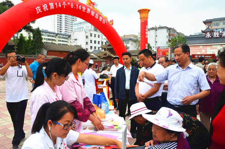2017年6月14日上午,市卫生计生委在秦安县举办世界献血者日宣传活动。天水市中心血站、秦安县各医疗卫生单位、市县无偿献血志愿者开展了无偿献血宣传、咨询、义诊等活动。