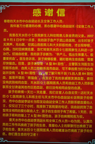 2017年9月8日下午,407医院儿科一名刚出生3天的新生儿因重度贫血,急需输血抢救,而所需的血型是RH阴性A型血,也就是俗称的“熊猫血”,407医院儿科主任紧急联系天水血站后,血站库存中目前没有这个血型。 站领导得知这一情况后,高度重视,马上安排部署,启动应急预案。采取双保障措施,一面由业务科联系周边兄弟血站,寻求支援,紧急调血。一面由宣传招募科通过组建的“天水市稀有血型互助微信群”及稀有血型档案库发布信息,电话联系,寻找血源。 各部门立即行动,在得知兄弟血站也都没有储备到此种血液时,大家的希望落到了宣传招募科身上,科室接到通知后,全科人员第一时间,发布信息电话联系,得到了广大群友的高度关注和热心帮助,短短几分钟内,就有10多名群友给予回复和转发,大家都非常想帮助小婴儿,但他们中有的献血间隔期不到,有的在孕期,有的在哺乳期,有的在外地,当工作人员带着激动而失望的心情在群中不停的交流时,功夫不负有心人,电话那头传来了招募员小崔激动急切而又紧张的声音:“喂!您能来血站献血吗?您在哪?我们派车去接您可以吗?”十分钟后,电话中那个爱心人士来到了我们面前,他叫牛卫东。与此同时,稀有血型互助群中也有几名群友做好了献血的准备。血源保障了,站领导松了一口气,宣传招募科全科人员松了一口气。 目前小婴儿经过抢救,已脱离危险,正在恢复中。婴儿的父亲专门到血站致谢,并送锦旗一面。