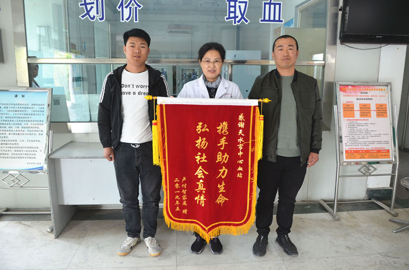 5月13日上午,天水市中心血站迎来两位RH阴性稀有血患者家属,他们手持一面印有 “携手助力生命 弘扬社会真情”字样的锦旗,特来向血站领导及工作人员表达其父亲在抢救治疗过程中全力以赴筹备血液的感激之情。