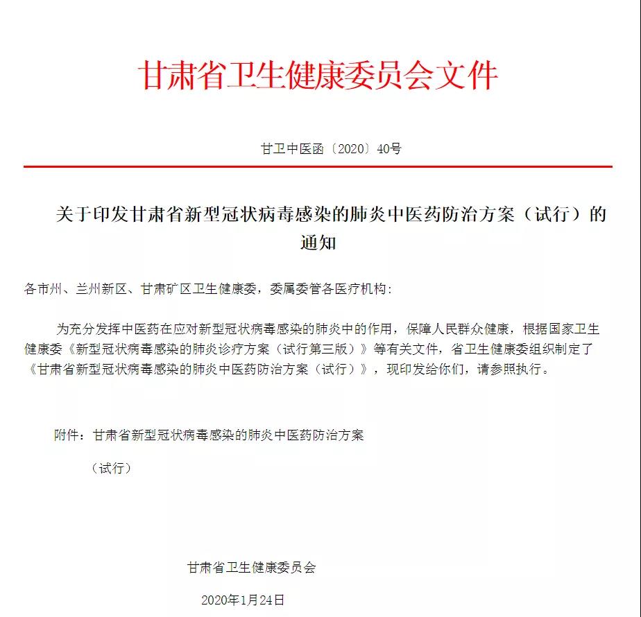 本病属于中医学“疫病”范畴,多因感受温热毒邪所致,病位在肺。在国家卫生健康委《新型冠状病毒感染的肺炎诊疗方案(试行第三版)》的基础上,根据甘肃地域特点及工作实际,充分发挥中医药“治未病”思想,从预防和治疗两个方面制定本方案。