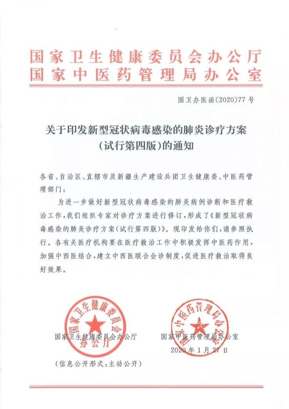 各省、自治区、直辖市及计划单列市、新疆生产建设兵团卫生健康委、中医药管理部门: 为进一步指导全国科学规范做好新型冠状病毒感染的肺炎病例诊断和医疗救治工作,我们组织专家对诊疗方案进行修订,形成了《新型冠状病毒感染的肺炎诊疗方案(试行第四版)》。现印发给你们,请参照执行。各有关医疗结构要在医疗救治工作中积极发挥中医药作用,加强中西医结合,简历中西医联合会诊制度,促进医疗救治取得良好效果。