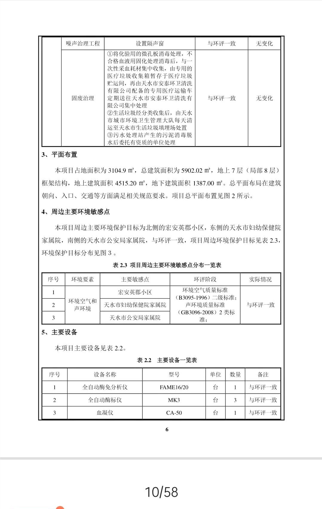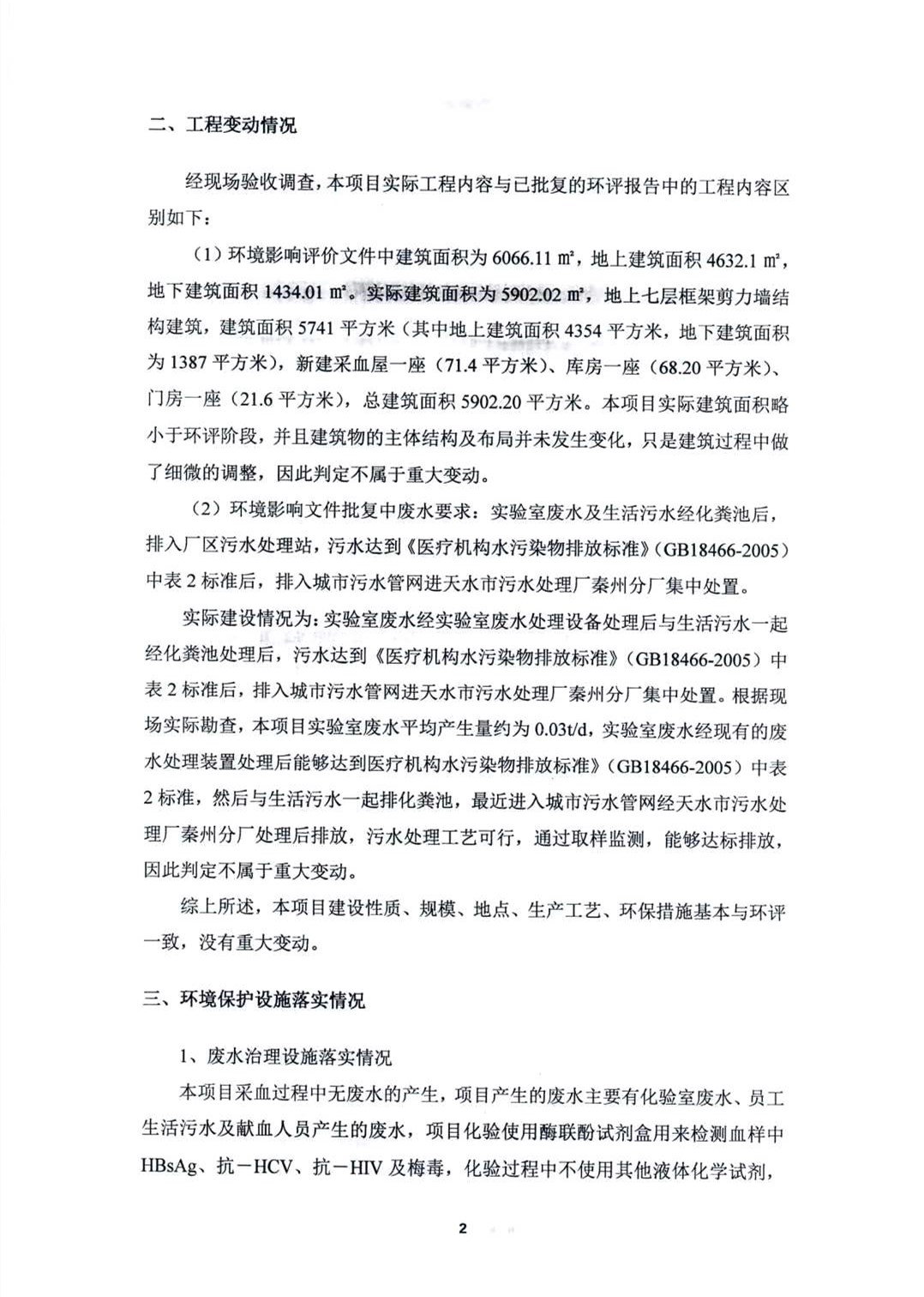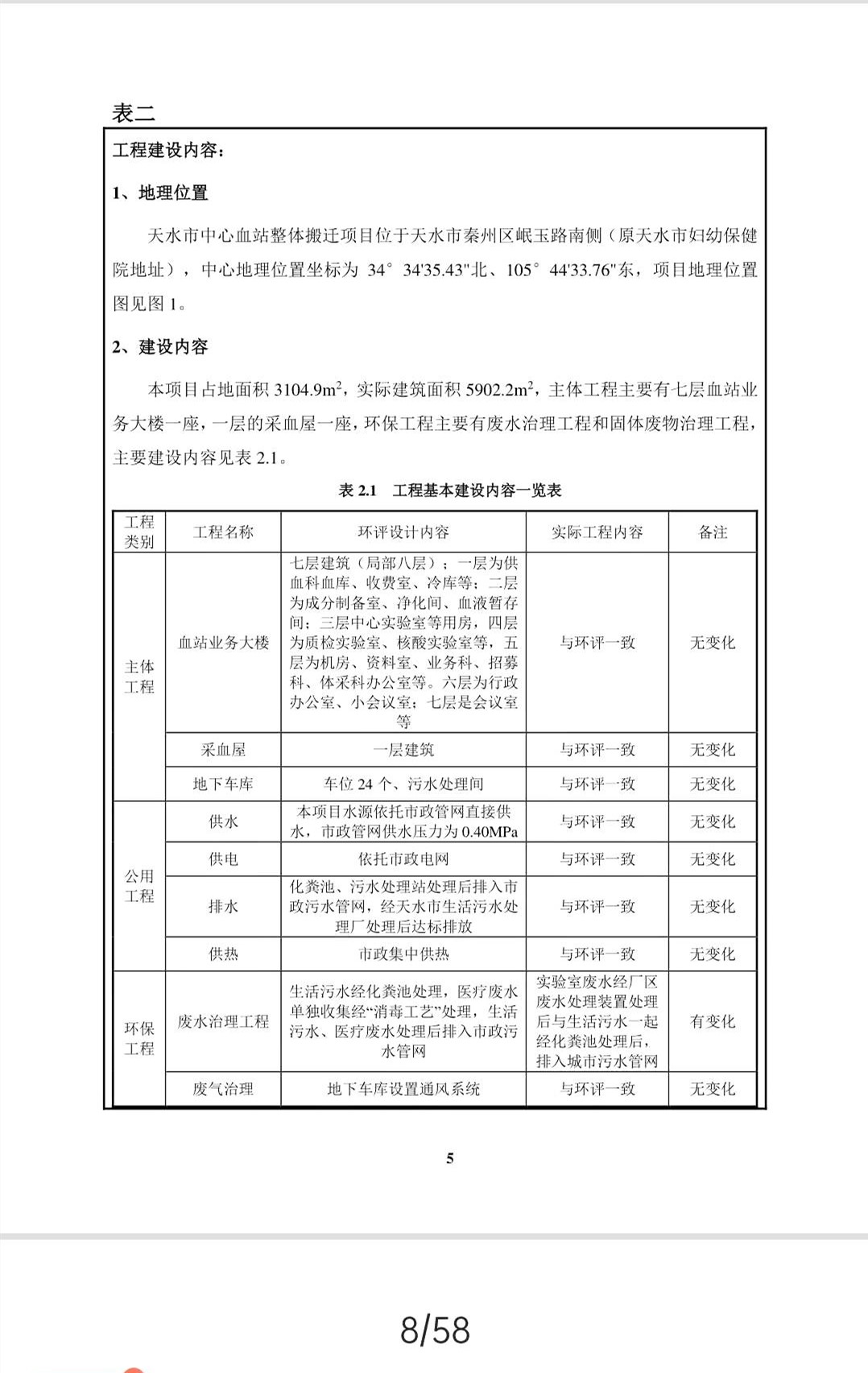 建设内容:本项目占地面积3104.9m2,实际建筑面积5902.2m2,主体工程主要有七层血站业务大楼一座,一层的采血屋一座,环保工程主要有废水治理工程和固体废物治理工程。
