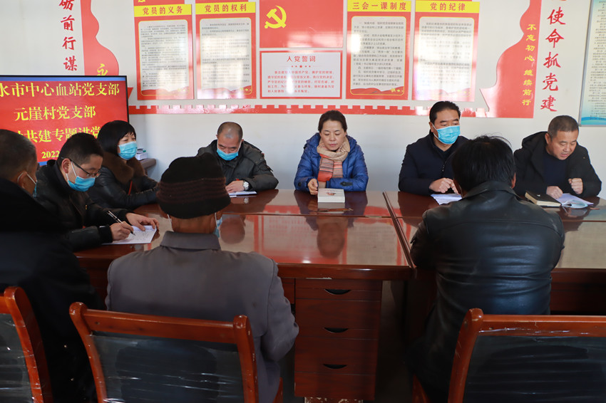 慰问结束后,市中心血站党支部和武山县滩歌镇元崖村党支部共同开展结对共建专题活动,会上,天水市中心血站副站长杨双六同志为全体党员讲授了《学习贯彻二十大精神助推帮扶村振兴工作》为主题的专题党课。