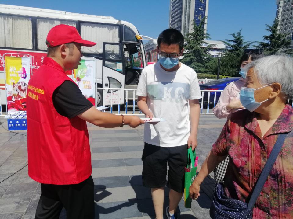 6月14日上午9点,宣传活动正式开始,志愿者们发放宣传单,组织开展无偿献血。