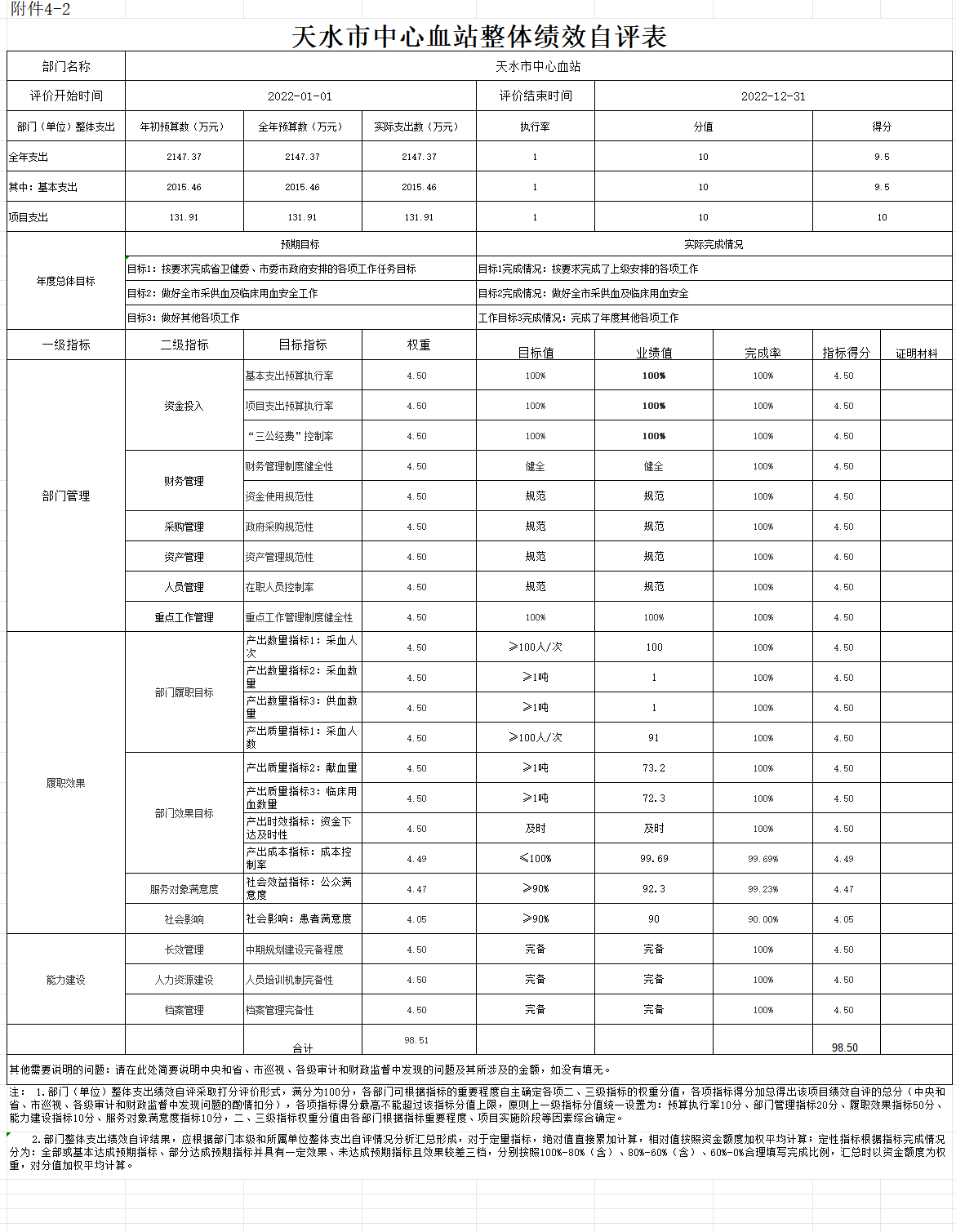 全年总体绩效目标完成情况良好,共完成部门管理中资金投入、财务管理、采购管理、资产管理、人员管理、重点工作管理指标以及服务对象满意度指标。