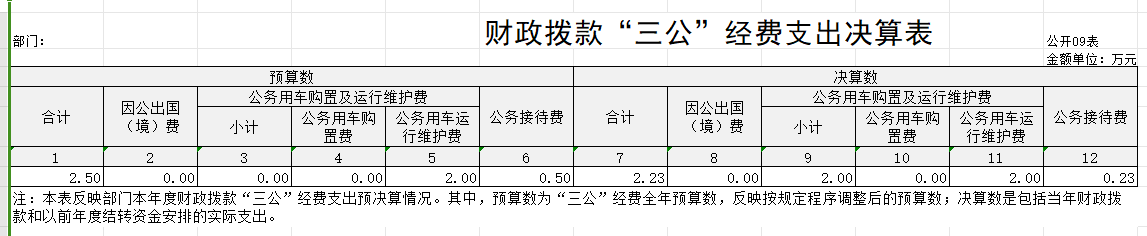 十一、“三公”经费:指用一般公共预算财政拨款安排的因公出国(境)费、公务用车购置及运行维护费、公务接待费。其中,因公出国(境)费反映单位公务出国(境)的国际旅费、国外城市间交通费、住宿费、伙食费、培训费、公杂费等支出;公务用车购置费反映单位公务用车购置支出(含车辆购置税);公务用车运行维护费反映单位按规定保留的公务用车燃料费、维修费、过路过桥费、保险费、安全奖励费用等支出;公务接待费反映单位按规定开支的各类公务接待(含外宾接待)支出。