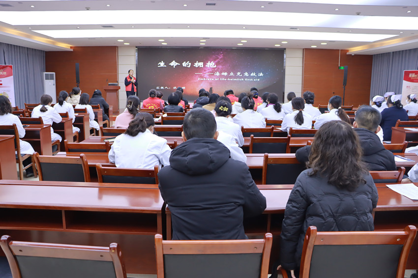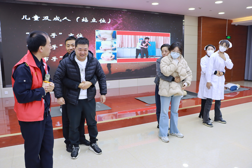 随后,护理部伏向明同志又给大家讲解了以“生命的拥抱”为主题的海姆立克急救法。从概念入手,详细讲解了海姆立克的四种征象和操作的具体步骤。通过互动问答、实际演示、亲自操作,大家明确了站立式、仰卧式和自救的具体操作步骤。