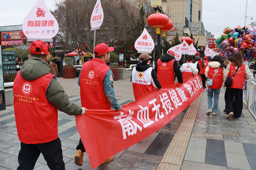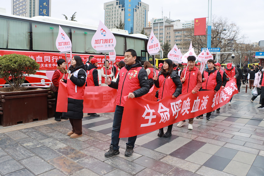 3月3日下午,天水市中心血站在龙城广场开展以“传递爱心 热血同行”学雷锋无偿献血为主题的徒步活动,来自天水市中心血站、天水市红十字会、天水市红十字无偿献血志愿服务队40余名无偿献血志愿者上街徒步宣传无偿献血知识。