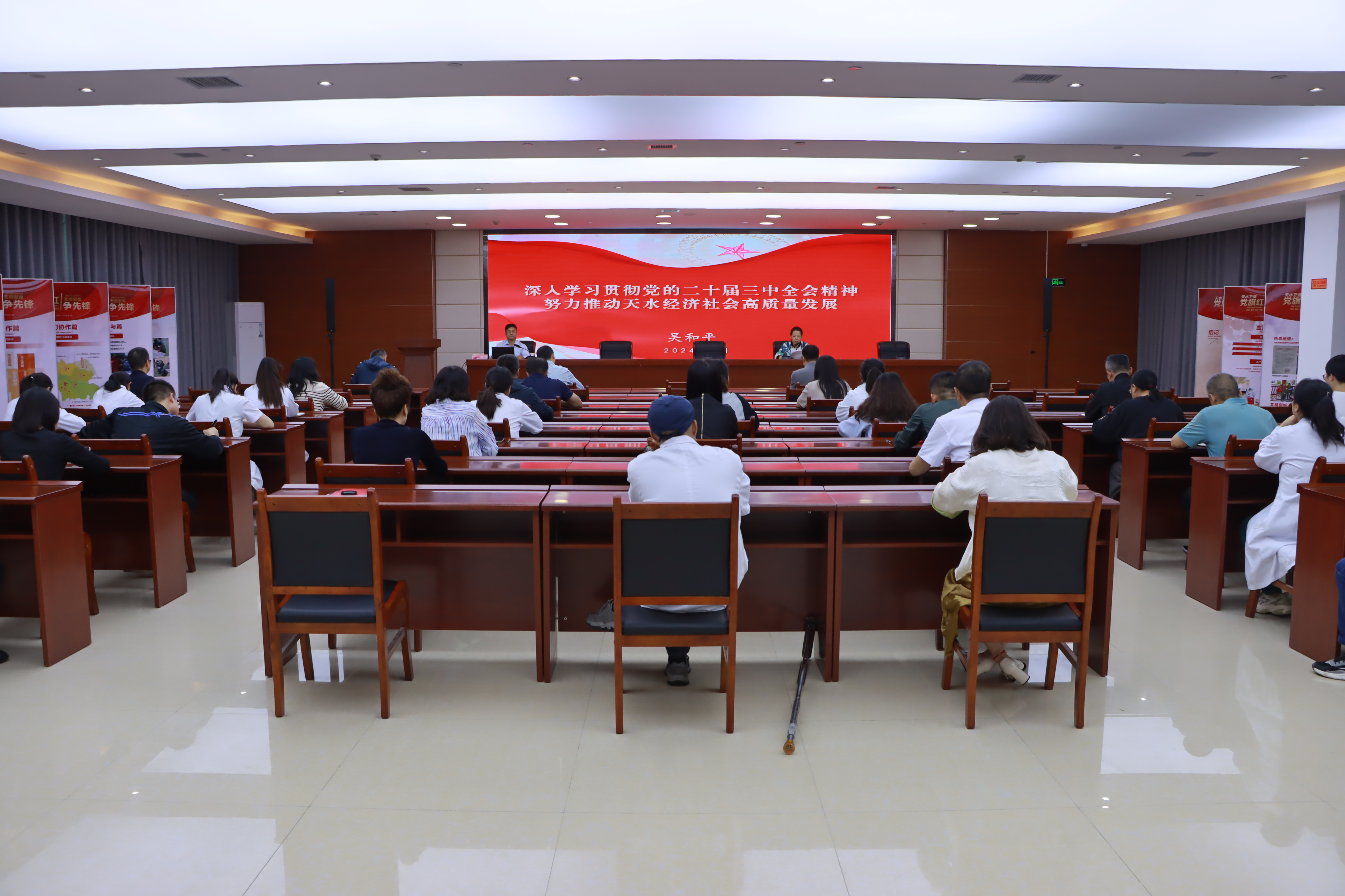吴会长以《深入学习贯彻党的二十届三中全会精神努力推动天水经济社会高质量发展》为题,从“这次全会是在以中国式现代化全面推进强国建设、民族复兴伟业的关键时期召开的一次十分重要的会议”“深入学习领会习近平总书记在党的二十届三中全会上的重要讲话精神”“全面准确理解《决定》提出的进一步全面深化改革重大举措”“全力以赴抓好全会精神贯彻落实”四个方面,灵活运用多方实际案例,结合当下工作现状,对全会精神进行全面系统地解读。宣讲内容主题鲜明、内涵丰富、深入浅出、重点突出,让我们对党的二十届三中全会精神有了更加全面、深刻地理解。