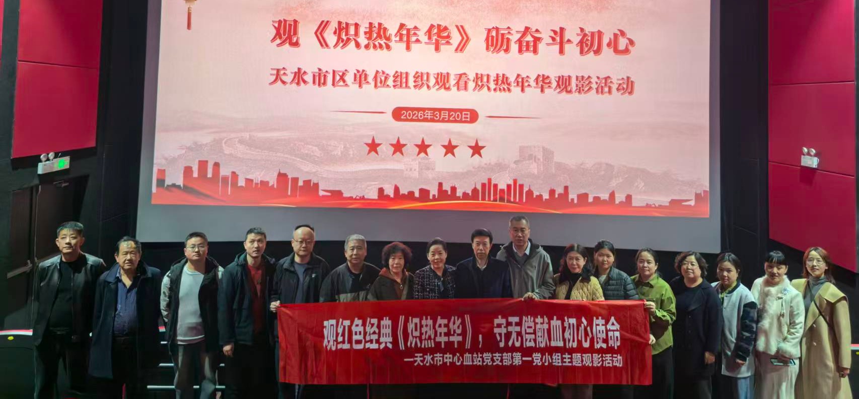 3月20日下午,天水市中心血站党支部组织开展红色影片《炽热年华》主题观影活动。活动由站第一党小组牵头,退休党员、入党积极分子及共青团代表共20余人,在天水秦州万达影城观看。