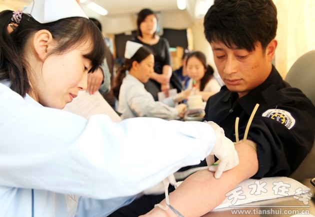 4月28日上午,天水市第一人民医院积极响应市卫生局和市献血办的号召,开展了 “践行群众路线,保障生命健康”为主题的职工无偿献血活动,发挥广大卫生医务工作人员献血救人的表率作用,用实际行动维护人民群众生命安全。 市中心血站的采血车一停到院内,无偿献血活动就开始了,填表、体检、化验、采血一个个步骤有序展开。参加献血的不仅有医院临床一线、医技科室、后勤保障的工作人员,还有科主任、护士长等医务人员。甚至有的医护人员刚刚下夜班,不顾工作的劳累也匆匆赶来献血,充分体现了天水市第一人民医院职工互助友爱、乐于奉献的精神风貌。
