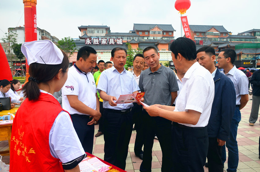 2017年6月14日上午,市卫生计生委在秦安县举办世界献血者日宣传活动。天水市中心血站、秦安县各医疗卫生单位、市县无偿献血志愿者开展了无偿献血宣传、咨询、义诊等活动。