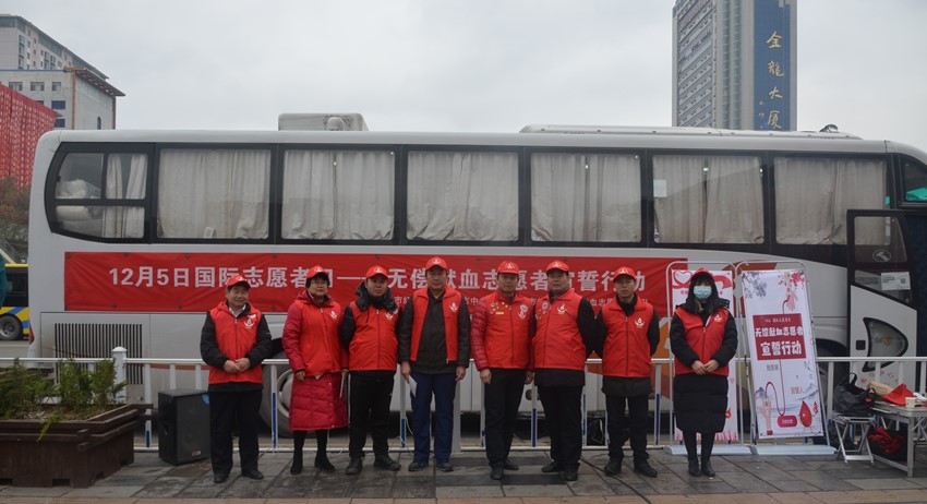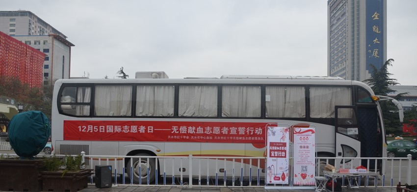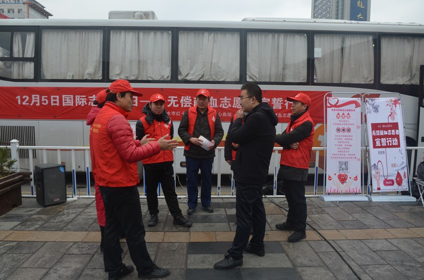 今年12月5日是第35个国际志愿者日,为大力弘扬“奉献、友爱、互助、进步”的志愿者精神,推动无偿献血公益事业发展,当天上午,天水市红十字会、天水市中心血站、天水市红十字无偿献血志愿服务队共同在龙城广场献血车旁开展了庆祝“12.5国际志愿者日——无偿献血志愿服务者宣誓行动”为主题的宣传活动。