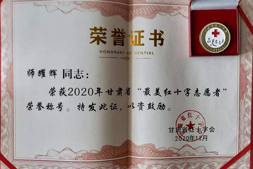 近日,天水市红十字无偿献血志愿者服务队副队长师耀辉荣获2020年甘肃省“最美红十字志愿者”称号,受到省红十字会通报表彰,天水市红十字会颁发了荣誉证书和奖章。