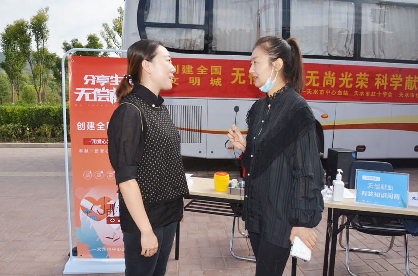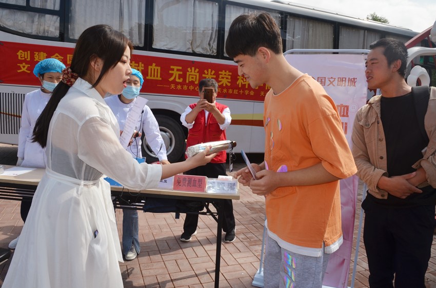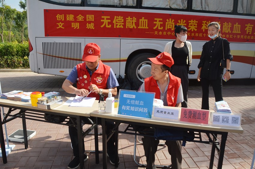 为深入贯彻落实天水市创建全国文明城市工作指挥部办公室关于印发《“创建全国文明城、在职党员先锋行”志愿服务和近期创城志愿服务重点任务》的通知精神,进一步深化党员学习教育“我为群众办实事”实践活动,广泛动员党员干部和社会群众积极主动参与无偿献血,扎实推进我市新一轮创建全国文明城市工作上水平、创佳绩。9月10日,天水市中心血站、天水市红十字会、天水市红十字无偿献血志愿者服务队共同在万达广场流动采血车前开展“创建全国文明城·无偿献血公益宣传”活动。